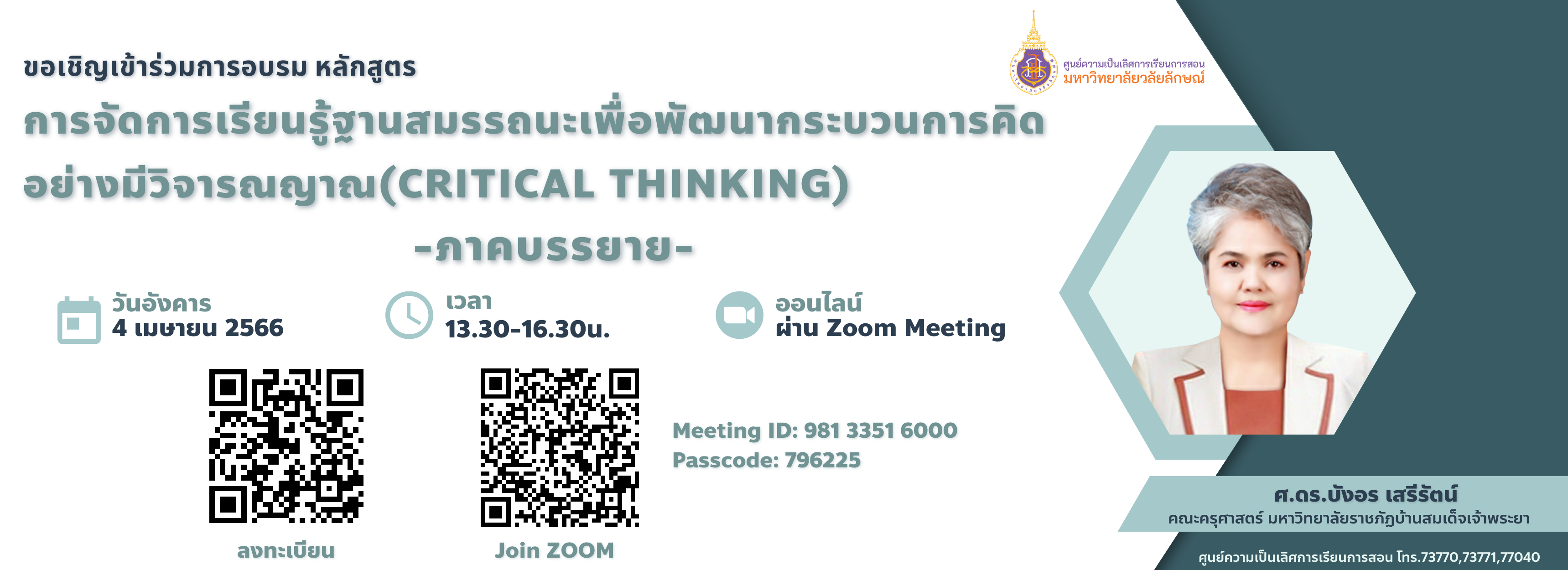 | ชื่อกิจกรรม | อบรม การจัดการเรียนรู้ฐานสมรรถนะเพื่อพัฒนากระบวนการคิดอย่างมีวิจารณญาณ (Critical Thinking) (ภาคบรรยาย) วันที่ 4 เม.ย. 2566 |