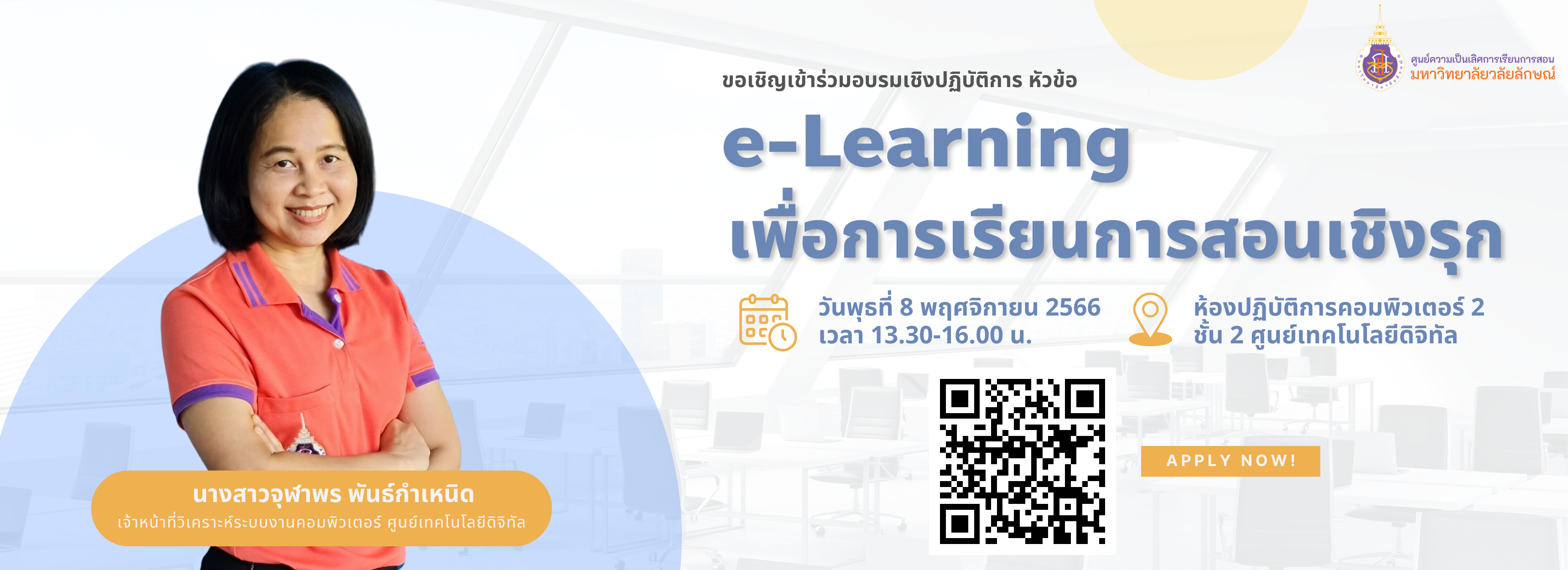 วัน/เวลา : วันพุธที่ 8 พฤศจิกายน 2566 เวลา 13.30 - 16.00 น. สถานที่ : ห้องปฏิบัติการคอมพิวเตอร์ 2 ศูนย์เทคโนโลยีดิจิทัล ภาษาที่ใช้ : ภาษาไทย รูปแบบการจัด : on site รูปแบบกิจกรรม : บรรยาย และฝึกปฏิบัติการ การใช้งาน e-learning เพื่อการเรียนการสอนเชิงรุก |