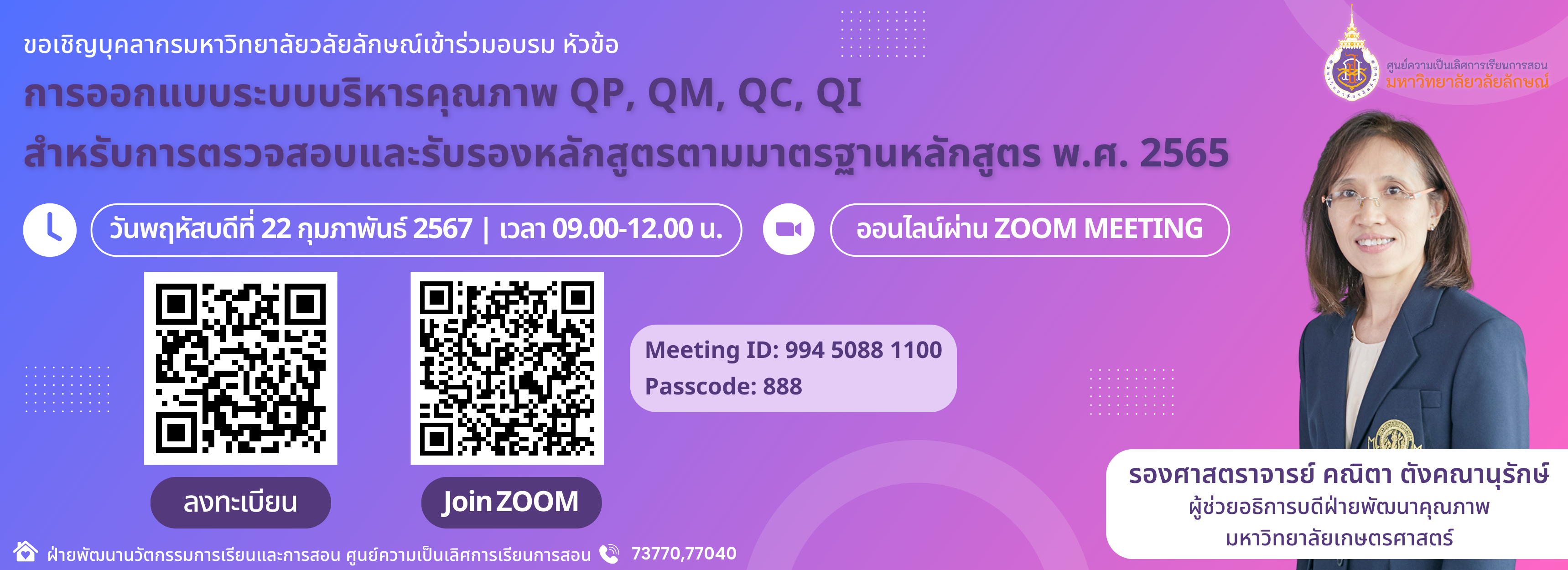| วิทยากร | รองศาสตราจารย์ คณิตา ตังคณานุรักษ์ ผู้ช่วยอธิการบดีฝ่ายพัฒนาคุณภาพ มหาวิทยาลัยเกษตรศาสตร์ |