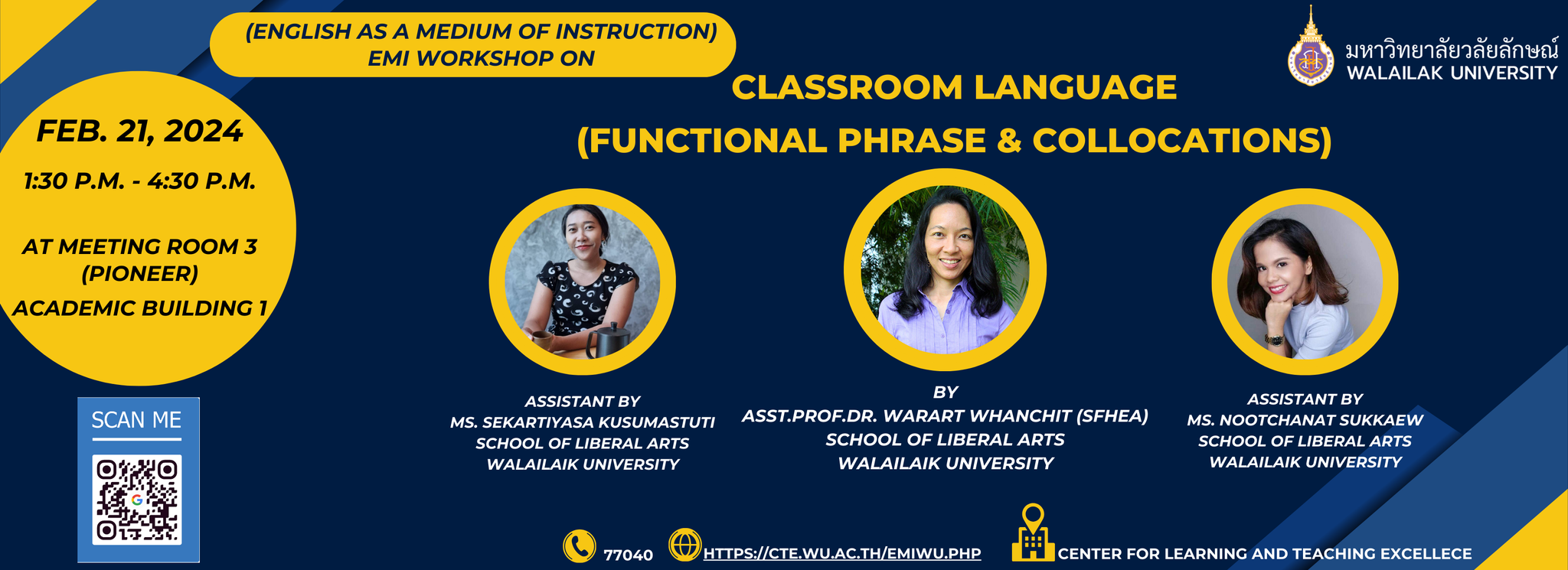 | ชื่อกิจกรรม | EMI workshops on Classroom Language (Functional Phrases & Collocations) 21, February 2024 |
