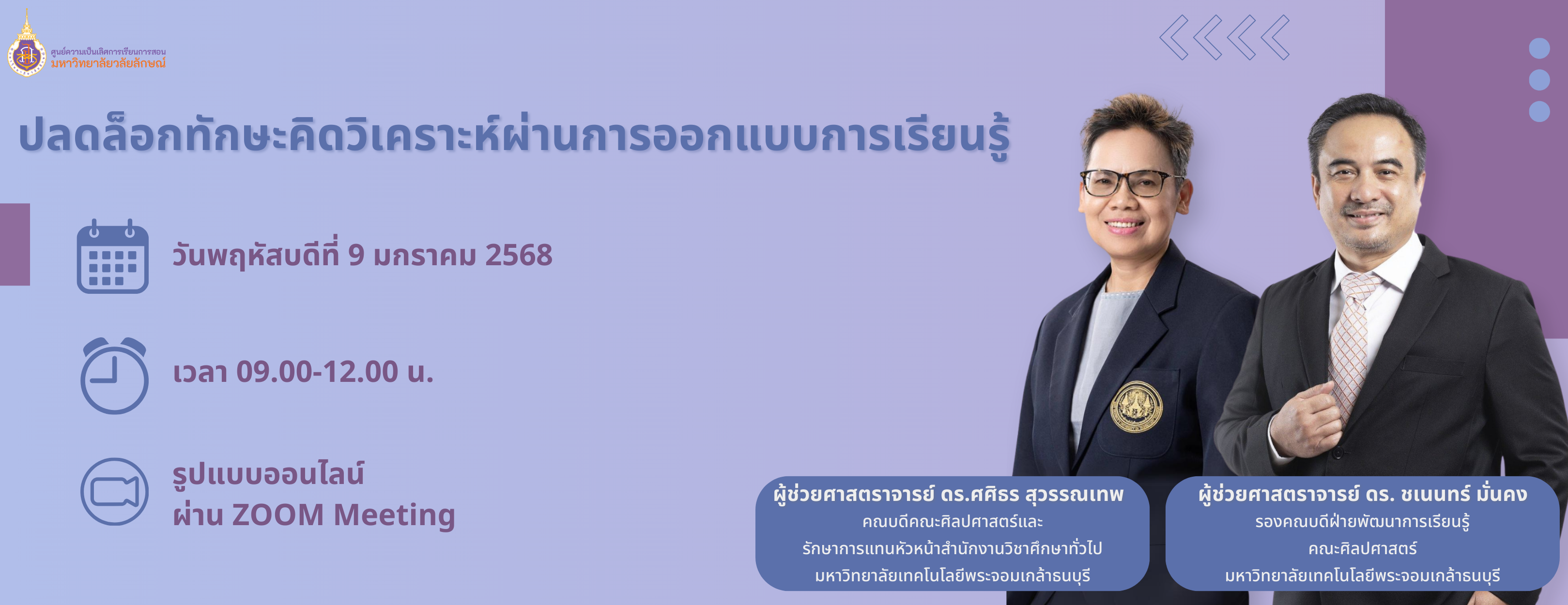 | วิทยากร | 1.ผู้ช่วยศาสตราจารย์ ดร.ศศิธร สุวรรณเทพ คณบดีคณะศิลปศาสตร์และรักษาการแทนหัวหน้าสำนักงานวิชาศึกษาทั่วไป มหาวิทยาลัยเทคโนโลยีพระจอมเกล้าธนบุรี 2.ผู้ช่วยศาสตราจารย์ ดร. ชเนนทร์ มั่นคง รองคณบดีฝ่ายพัฒนาการเรียนรู้ คณะศิลปศาสตร์ มหาวิทยาลัยเทคโนโลยีพระจอมเกล้าธนบุรี |