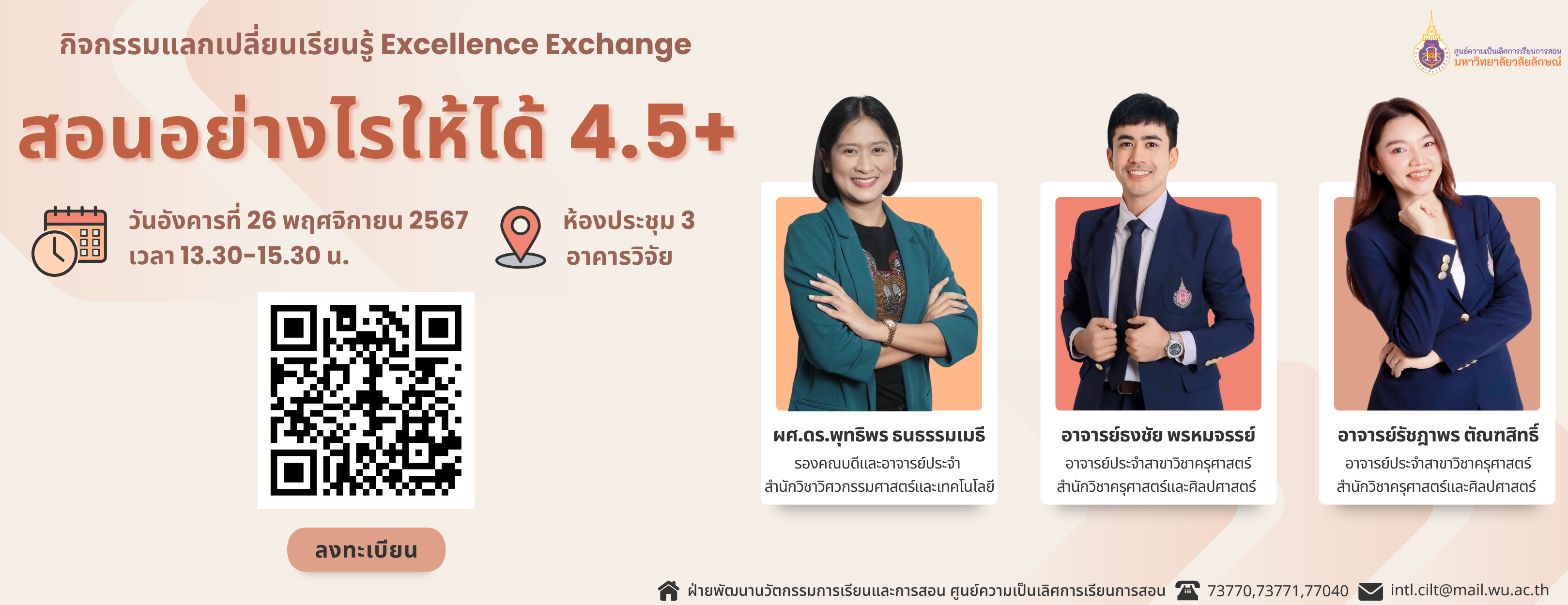 | ชื่อกิจกรรม | กิจกรรมแลกเปลี่ยนเรียนรู้ Excellence Exchange: สอนอย่างไรให้ได้ 4.5+ |