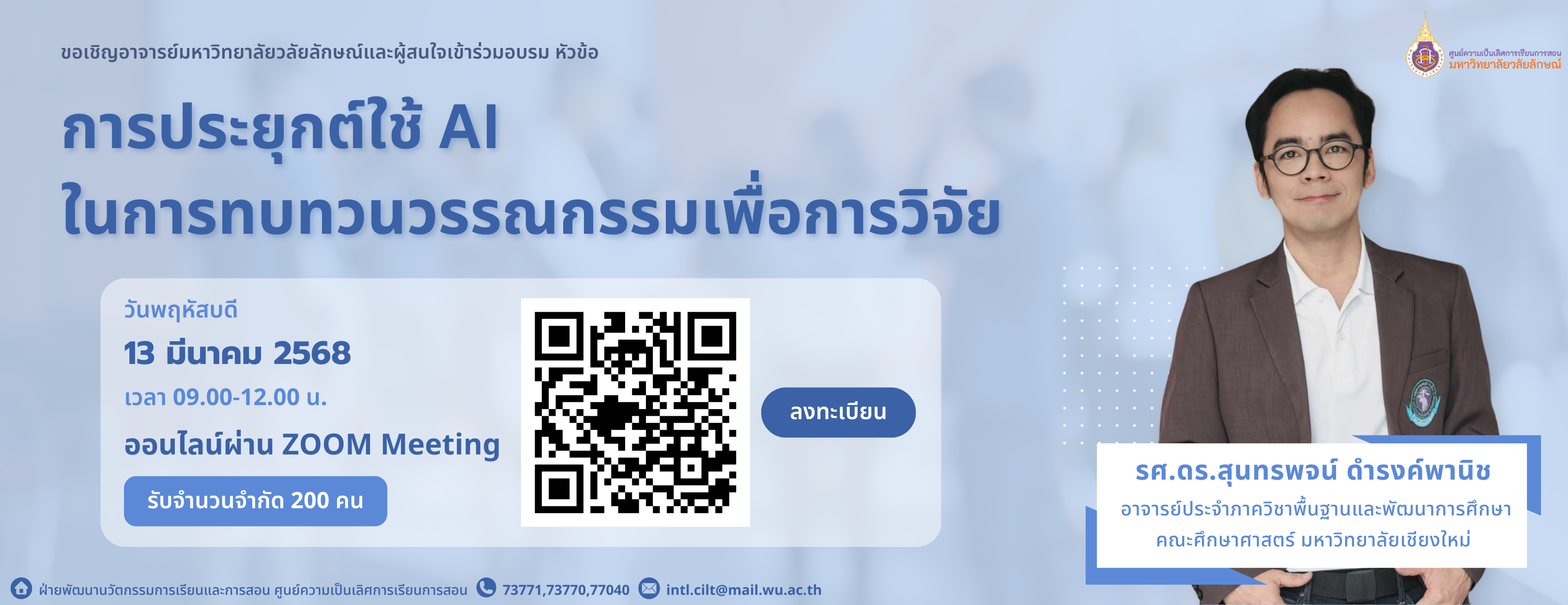 | ชื่อกิจกรรม | อบรม เรื่อง การประยุกต์ใช้ AI ในการทบทวนวรรณกรรมเพื่อการวิจัย วันที่ 13 มี.ค. 2568 |