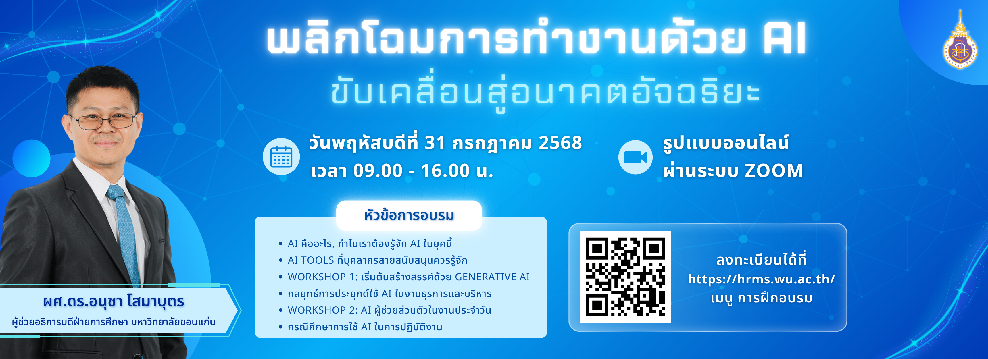อบรมหลักสูตร พลิกโฉมการทำงานด้วย AI ขับเคลื่อนสู่อนาคตอัจฉริยะ วันที่ 31 ก.ค. 2568 |