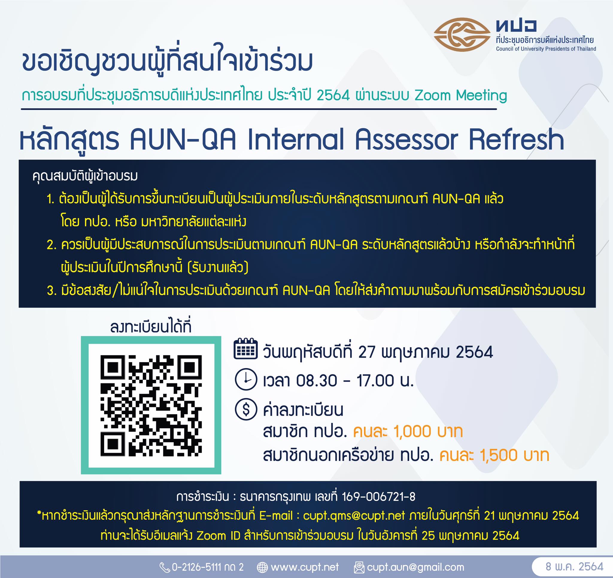 ขอเชิญผู้ที่สนใจเข้าร่วม หลักสูตร AUN-QA Internal Assessor Refresh จัดโดย ทปอ. วันที่ 27 พ.ค. 2564